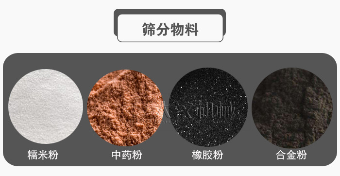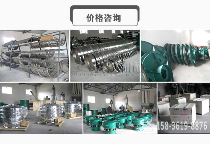 粉末振動篩主要由進料口、防塵蓋、出料口、束環、篩網、配重塊、上部重錘、振動體、振動電機、彈簧、下部重錘、機座等部分組成。